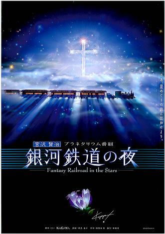 家内の用事で神戸のポートアイランドに行きました。用事が終わった後に、神戸市立青少年科学館のプラネタリウムで上映されている、「銀河鉄道の夜」という作品を見に行きました。この特別プログラムは、夕方の17:50からと19:00からの2回しか上映していません。宮沢賢治原作の「銀河鉄道の夜」を、CGアーティストKAGAYA氏が幻想的な作品に仕上げています。銀河鉄道の物語ではなく、物語をベースにした作者の心象風景といった感じの作品です。天の川沿いに、北十字星から南十字星までをめぐる40分の幻想的な擬似旅行です。CGを駆使しているため、実写では体験できないアングルからの映像を見ることが出来ます。後半に映し出される、上空へ飛び立つ鳥の目線から見る銀河鉄道周辺の風景は、本当に幻想的でした。昔、アニメ映画で見た「銀河鉄道の夜」を、また見てみたくなりました。家にビデオがあったはずなので探してみようかな。