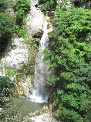 敦賀から北陸自動車道に入り福井ICで下ります。IC近くにある一乗谷の朝倉氏遺跡にも寄ってみました。一乗谷に着いたのは9時少し前です。ここまで4時間近くかかっています。一乗谷は戦国時代の遺跡で、戦国時代に越前国を支配した朝倉氏の居館および山城と城下町の跡があります。城下町は復元されていて見学できます。今から約500年前に、この地で人々が暮らしていたかと思うと感慨深いものがあります。資料館や遺跡を見て回っていると、あっという間に2時間半くらいたってしまいお昼時です。福井は越前蕎麦が有名です。近くに雰囲気の良さそうな蕎麦屋「利休庵」があったので入ってみました。山菜のてんぷらとおろし蕎麦、そばがきを注文しました。おろし蕎麦は美味しかったです。蕎麦を食べた後、遺跡横を流れる一乗谷川上流にある「一乗滝」へ行ってみました。落差12mの荘厳な滝で、巌流島で宮本武蔵と戦った剣豪、佐々木小次郎は、この滝で修行を積み、かの秘剣「つばめ返し」をあみだした所という言い伝えがあるそうです。行ってみると人が多くてビックリしました。涼を求めて人が集まってきている感じです。一乗滝を後にして、R158を東進し九頭竜湖に向かいます。九頭竜湖にある道の駅「九頭竜」で休息。その後、東海北陸自動車道で少し南下し郡上八幡へ。今日のドライブの本命地です。