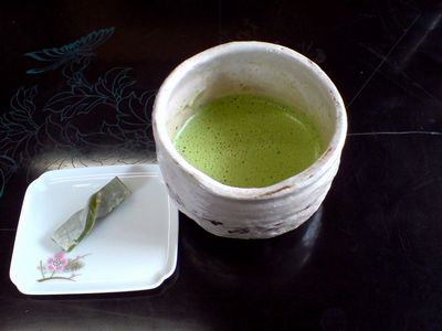 石臼でお茶葉を挽いて、茶碗にいれお湯をそそいで茶筅でまわします。