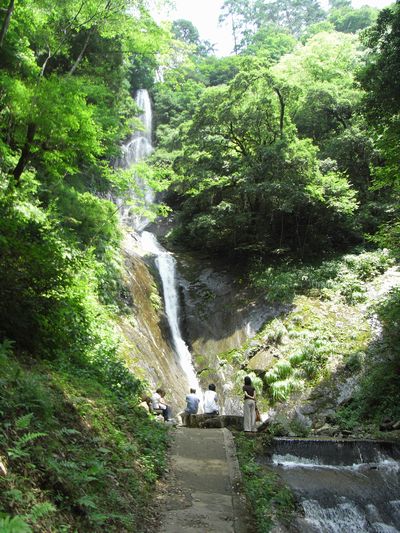 道の駅「ハチ北」を過ぎて「猿尾滝口」の案内板を右折し1Kmほど進むと駐車場があります。駐車場から滝までは、ほんの数分です。この滝は上段と下段の二つの滝に分かれています。駐車場から少し歩いて左を見ると滝の全景が見えます。各々が落差30m、上下で落差60mの滝です。結構、見応えがある滝です。さすがに日本の滝百選に選ばれている滝です。上段の滝下に行ける道があったので滝下まで行ってみました。すごい迫力です。下を見ると足がすくみます。滝の中にマリア像や仏像、観音像が見えると案内板にありますが、どこに見えるのか良く分かりませんでした。無理すれば見えないこともないですが...。ともかく、滝の近くに居ると本当に涼しいです。気温は35度にもかかわらず、滝の近くは28度くらいの感じです。クーラーの涼しさではなく自然の涼しさは格別です。病みつきになりそうです。近くに「女郎滝」という滝もあると聞いたので行ってみましたが、こちらは少々小ぶりでした。道路わきにあるため休憩する場所もなく、涼しさもイマイチでした。
