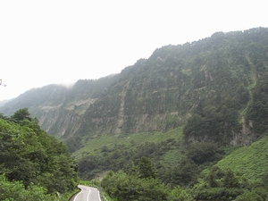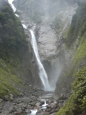 カレーを食べた後、称名滝に向かいます。「悪城の壁」といわれる絶壁を右手に見て車を走らせると駐車場が見えてきます。駐車場から称名滝までは徒歩で約15分です。少し登りの道をテクテク歩きます。前方に称名滝の最上部が見えてきます。滝に近づくにつれ滝上部に雲がかかり、なんとも幻想的な雰囲気になってきました。雨が降ってきそうな空模様です。称名滝は落差350m、落差日本一の滝だそうです。滝は4段構成になっています。正面から見る称名滝はまさに絶景です。滝だけでなく周辺の景色も素晴らしいです。雪解け水が増える春頃は称名滝右側に落差500mのハンノキ滝が出現するそうですが、夏には見ることが出来ません。常に存在しないため落差500mですが日本一にはならないそうです。滝近くは水しぶきがかかるほどで、とても涼しく寒いくらいです。次回はハンノキ滝が見える頃に訪れたいものです。