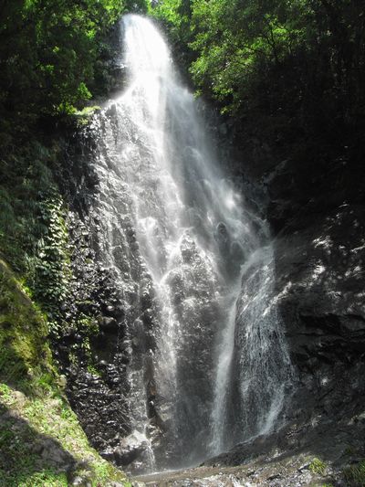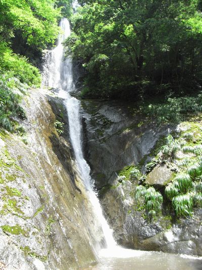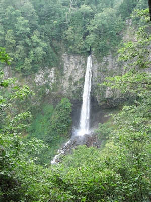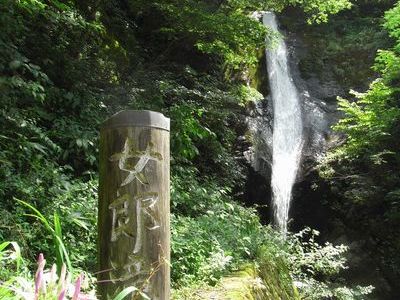 道の駅「ハチ北」を過ぎて「猿尾滝口」の案内板を右折し1Kmほど進むと駐車場があります。駐車場から滝までは、ほんの数分です。この滝は上段と下段の二つの滝に分かれています。駐車場から少し歩いて左を見ると滝の全景が見えます。各々が落差30m、上下で落差60mの滝です。結構、見応えがある滝です。さすがに日本の滝百選に選ばれている滝です。上段の滝下に行ける道があったので滝下まで行ってみました。すごい迫力です。下を見ると足がすくみます。滝の中にマリア像や仏像、観音像が見えると案内板にありますが、どこに見えるのか良く分かりませんでした。無理すれば見えないこともないですが...。ともかく、滝の近くに居ると本当に涼しいです。気温は35度にもかかわらず、滝の近くは28度くらいの感じです。クーラーの涼しさではなく自然の涼しさは格別です。病みつきになりそうです。近くに「女郎滝」という滝もあると聞いたので行ってみましたが、こちらは少々小ぶりでした。道路わきにあるため休憩する場所もなく、涼しさもイマイチでした。