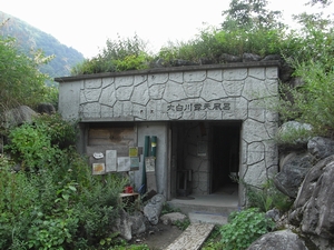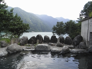 滝から更に2kmほどで白水湖に到着です。R156から20分もかかってしまいました。白水湖のそばに大白川露天風呂という温泉があります。そもそも20年前にここにきたのは、この秘湯といわれる温泉に入るためでした。今回も300円の入浴料を払って入浴しました。この温泉は、環境保護のためか洗い場がありません。露天風呂があるだけです。露天風呂からは目の前に白水湖、遠くに立山連峰や白山が見えます。正に絶景です。景色を見ながらボーっと温泉に浸かっているだけで極楽気分です。