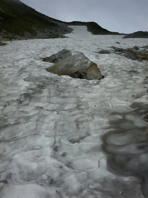 一の越に向かう道沿いにある雪渓 一の越山荘手前にある道標