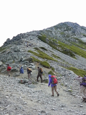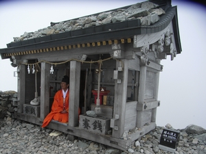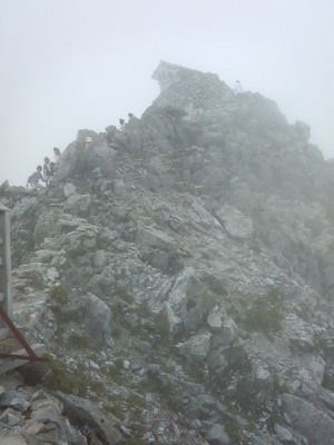 一の越までは数年前に登ったことがあります。その時は、ヘトヘトで雄山まで登る気力がありませんでしたが、今回はそれほど疲れずに登ることが出来ました。高山植物の写真を取りながらのんびりと登ったのと、大山や三田近郊の低山に登った経験が生かされたのかもしれません。山道を登っている途中、後ろを振り向くと素晴らしい景色が広がっています。ある意味、別世界です。所々に霧が発生していますが、「それもまた良し」です。途中、二箇所ほど雪が残っていて雪渓になっていました。8月に雪渓とはさすが立山です。小一時間程度で一の越山荘に到着。標高2,700mです。雄山山頂は相変わらず霧のなかです。気を引き締め、山頂を目指します。岩が多く少し登りにくい道ですが、変化に富んでいて飽きません。登るにつれて風が強くなってきます。時々、あたりが霧に包まれて前方が見えなくなります。無理せずにのんびりと登ります。雄山山頂手前にある売店に11時頃到着しました。予想以上に人がいてビックリしました。売店から更に少し登った所に雄山神社があり、そこが雄山山頂のようです。標高3,003mです。雄山神社へは500円の拝観料が必要です。山頂に神主さんが居てお祓いをしてくれ、お神酒まで頂けます。残念ながら霧が出ていて眺望は今一つですが、山頂まで登った達成感はあります。雄山の先に大汝山があります。次回は一の越山荘で一泊して、そちらまで足を延ばしたいと思います。