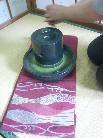 石臼でお茶葉を挽いて、茶碗にいれお湯をそそいで茶筅でまわします。