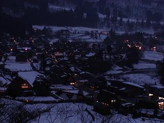 利賀村から白川郷へ。白川郷のライトアップは17:30からです。15:00から車は町に侵入できないようです。手前の山の上にある駐車場に車を止め、無料送迎バスで町へ。町はすごい人出です。正月にも来ましたが、その時の5倍くらいの人出です。展望台に登ってみると更に人があふれていました。17:30頃から次第に辺りが暗くなり、茅葺民家が少しずつライトアップされていくのがわかります。18:00頃にはかなり幻想的な雰囲気になります。雪が積もっているともっときれいに見えるそうです。来年も来てみようと思います。
